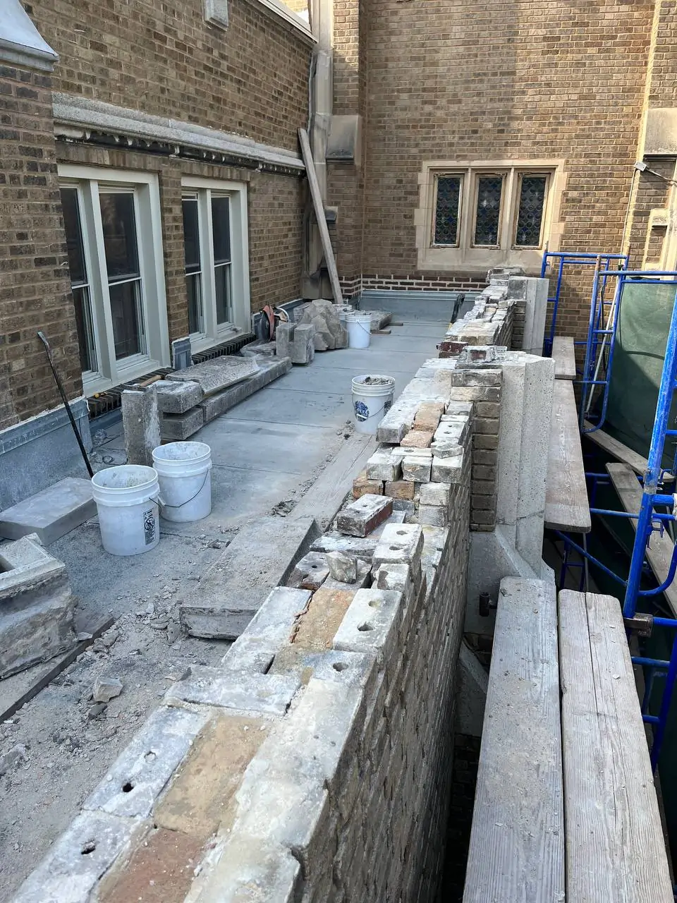 The restoration work began with evaluating the condition of the existing masonry and identifying areas where bricks or mortar joints had deteriorated. Damaged sections were carefully repaired to maintain the integrity of the original structure while ensuring that the restored areas blended naturally with the surrounding brickwork.